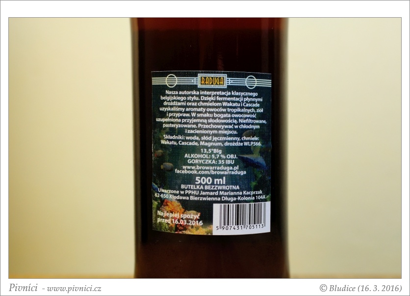 Zajímavý, čistý a příjemný a velmi pitelný Saison.Minimální trvanlivost: 16. března 2016