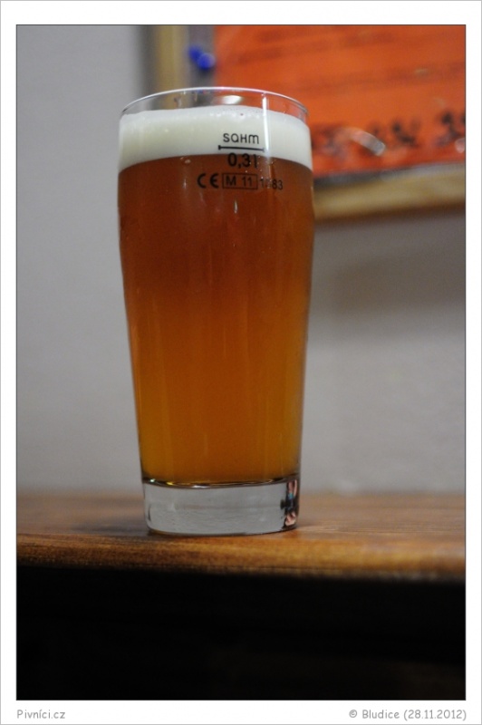 Světlejší zlatá barva, velmi zakalené, slušná světlá pěna, lehce kroužkuje.Vůně (1,5 - nedobré):