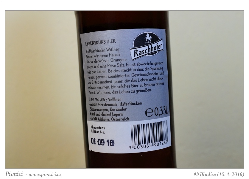 Osvěžující, čistý, velmi dobře pitelný Witbier.Minimální trvanlivost: 1. září 2016