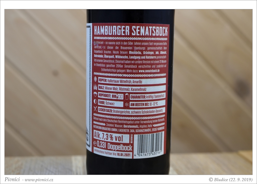 na dubových hoblinách dozrávaný doppelbock, blendovaný s menším množstvím doppelbocku dozrávaným 20 měsíců v sudu po brandy
