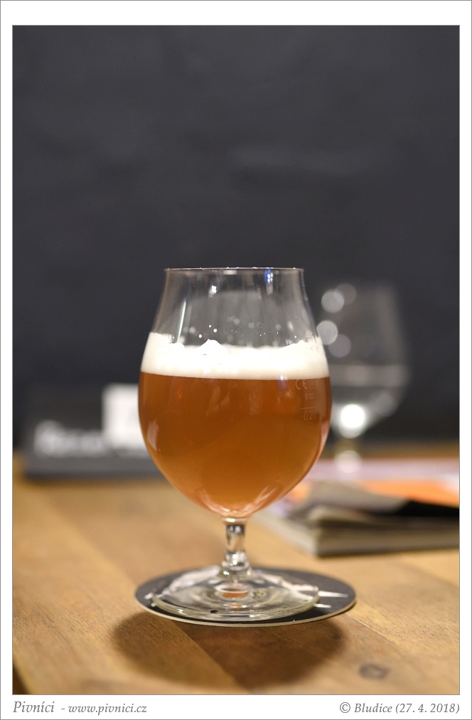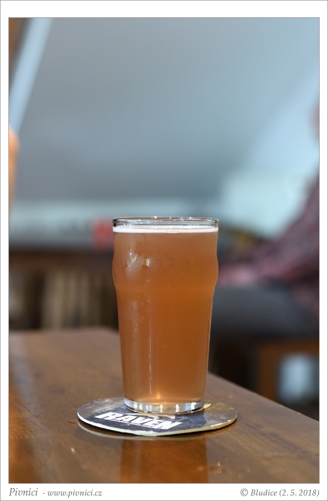 Zlatá barva, lehce zakalené. Pěkná světlá pěna, dobře drží.Vůně (4 - výborné):