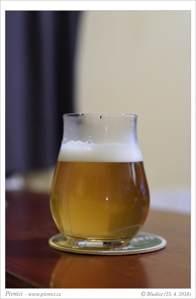 Světle zlatá barva, čiré, pěkná světlá pěna, dobře drží.Vůně (3,5 - velmi dobré):