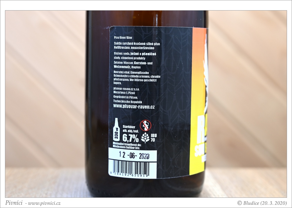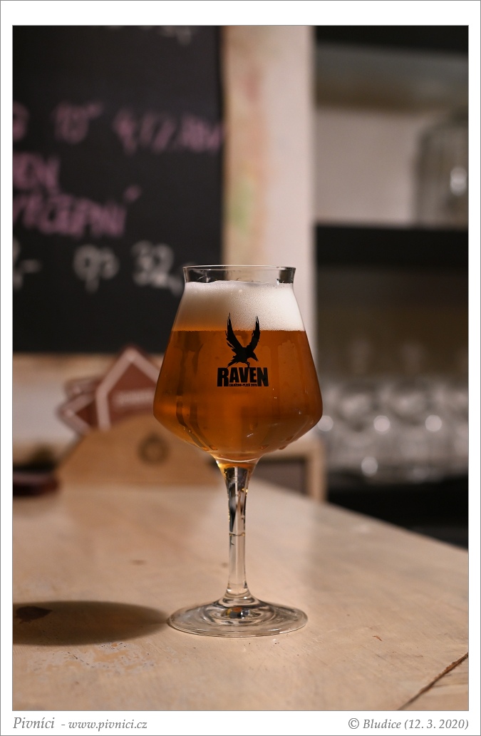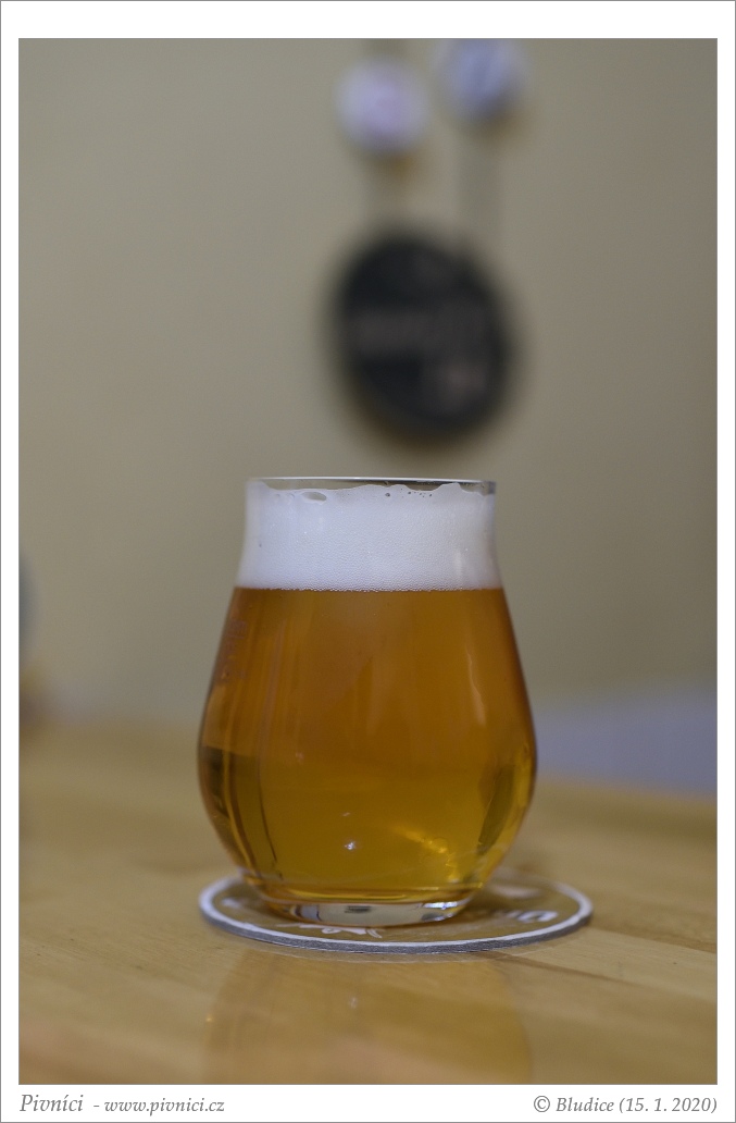 Zlatá barva, téměř čiré. Pěkná světlá pěna, dobře drží.Vůně (3,5 - velmi dobré):