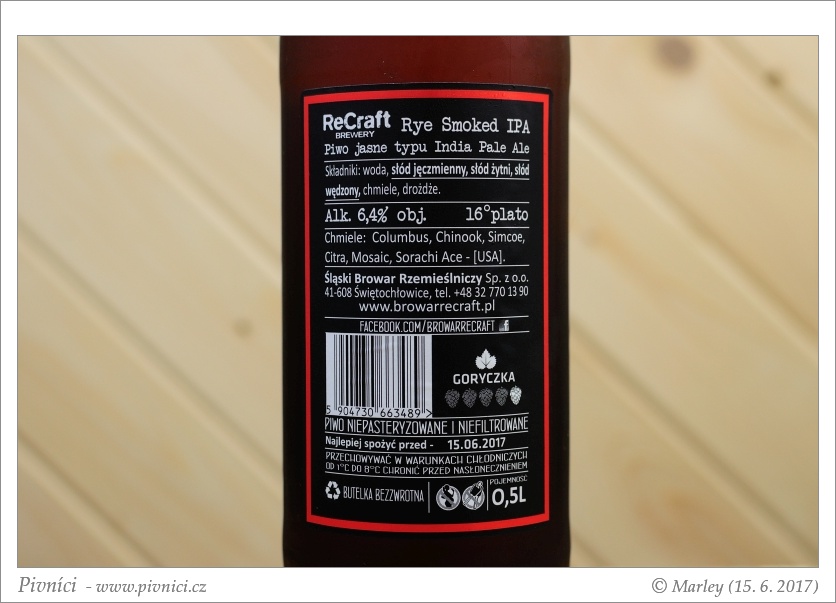 Velmi výrazné pivo, hodně chmelené, slušně nakuřované i žitné, velmi dobře se popíjí.Minimální trvanlivost: 15. června 2017