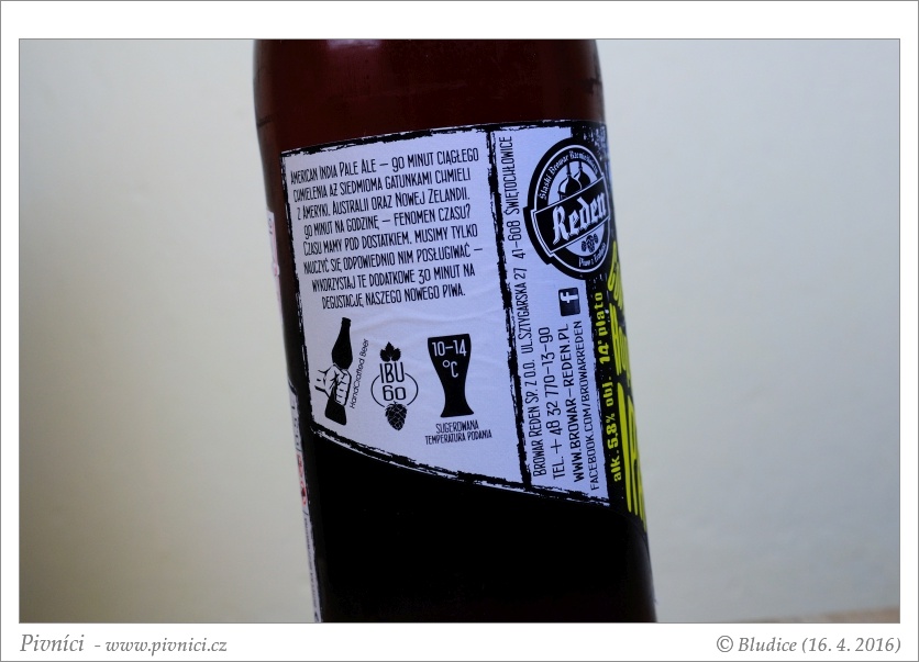 Měděná barva, prakticky čiré, pěkná světlá pěna, slušně drží.Vůně (3,5 - velmi dobré):