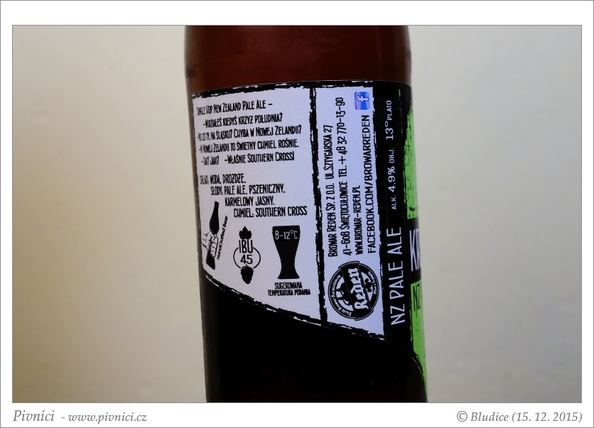 Fajn výrazně chmelené pivo. Dobře se pije.Minimální trvanlivost: 22. ledna 2016