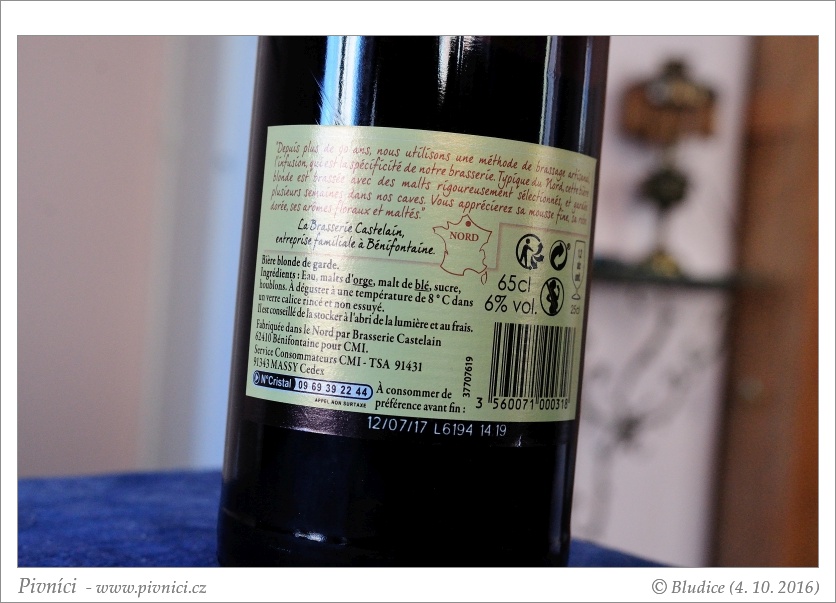 Barva tmavě zlatá, čiré. Pěkná hustá průměrně stabilní pěna. Kroužkuje.Vůně (3 - dobré):