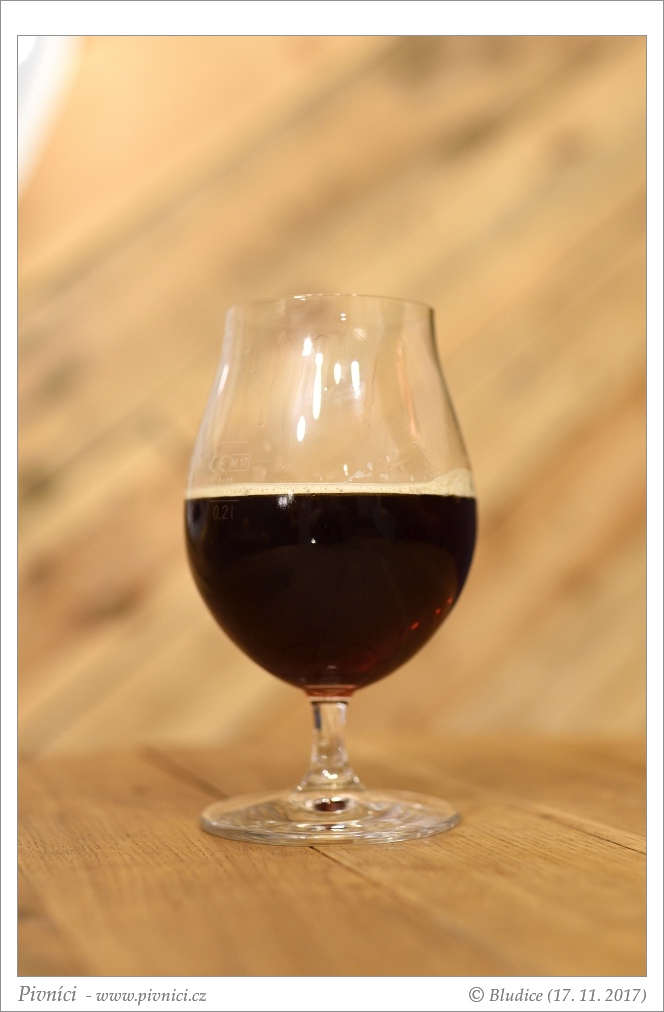 Mahagonová barva, čiré, pěkná světlá pěna s okrovým nádechem, dobře drží.Vůně (2,5 - lehce nadprůměr):