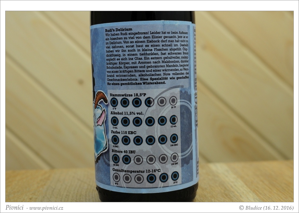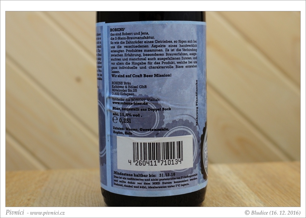 Chutný silný bock, výrazněji alkoholový. Velmi dobře se popíjí.Minimální trvanlivost: 31. prosince 2016