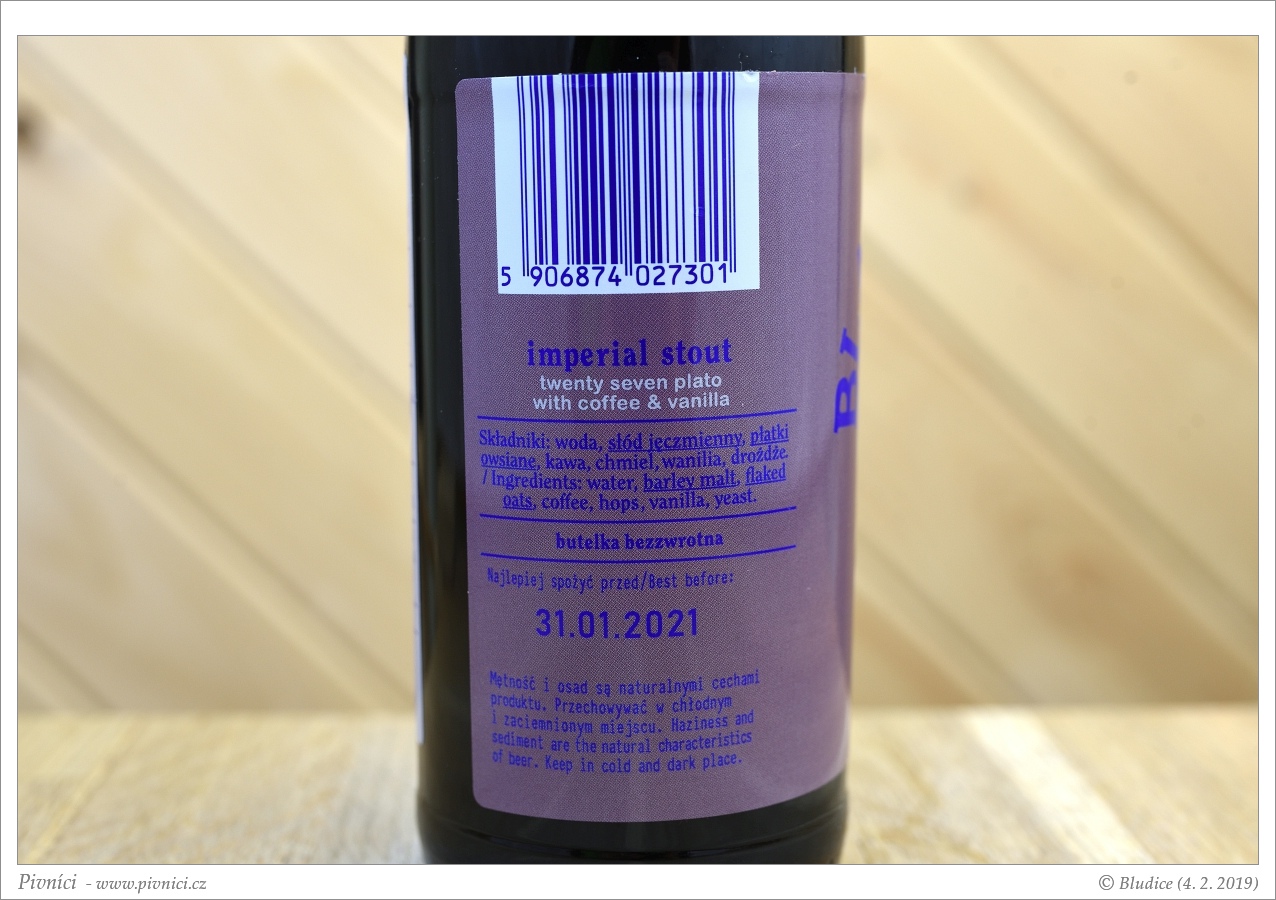 Chutný výrazněji vanilkový silný stout, výborně se popíjí.Minimální trvanlivost: 31. ledna 2021