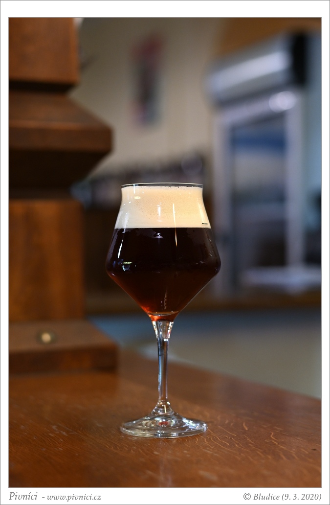 Mahagonová barva, lehce zakalené. Pěkná světle okrová pěna, dobře drží.Vůně (3,5 - velmi dobré):