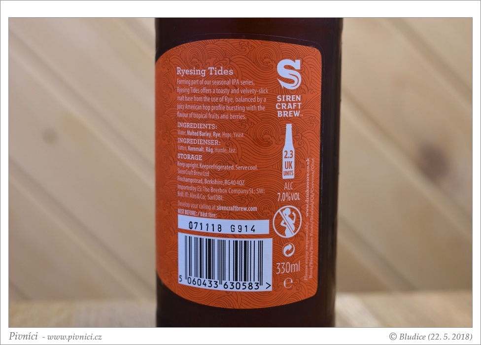 Chutná žitná IPA, vyvážená, pěkně chmelená, výborně se popíjí.Minimální trvanlivost: 7. listopadu 2018