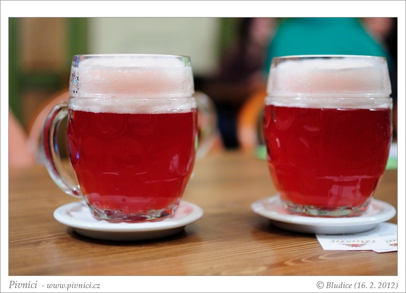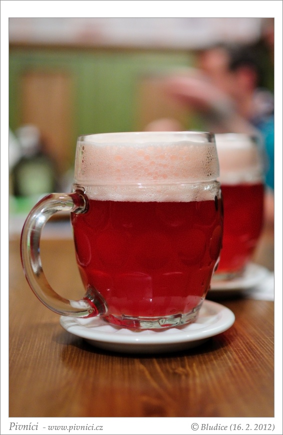 Barva červená, silně zakalené. Pěkná hustá stabilní růžová pěna.Vůně (2,5 - lehce nadprůměr):