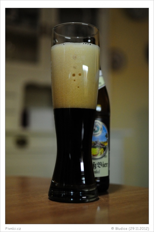 Barva tmavě hnědá, silně zakalené. Pěkná hustá stabilní pěna světle okrové barvy.Vůně (3,5 - velmi dobré):