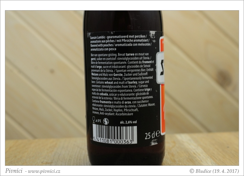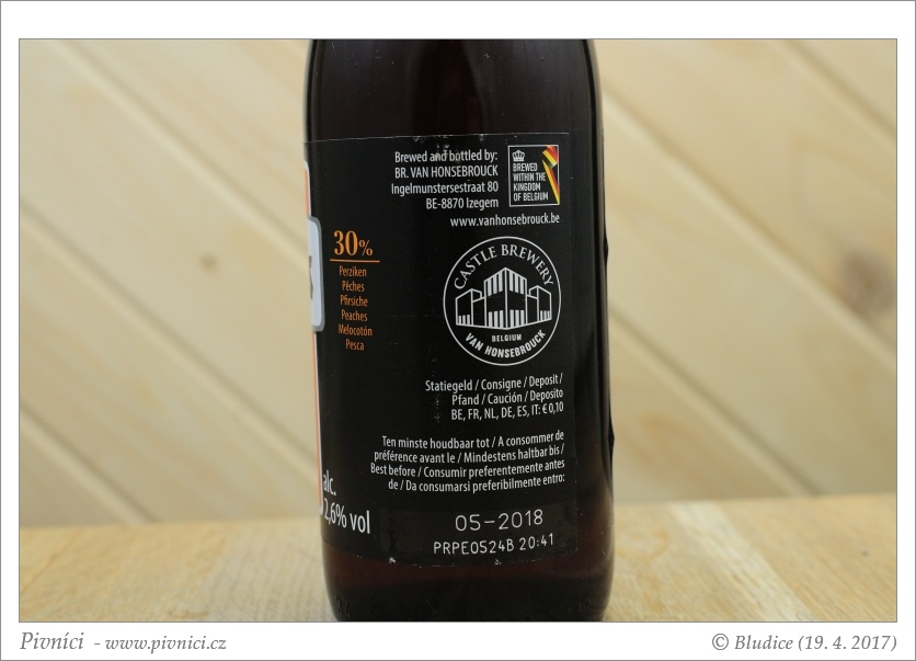 Světle měděná až oranžová barva, čiré, slušná světlá pěna s okrovým nádechem, slušně drží.Vůně (2,5 - lehce nadprůměr):