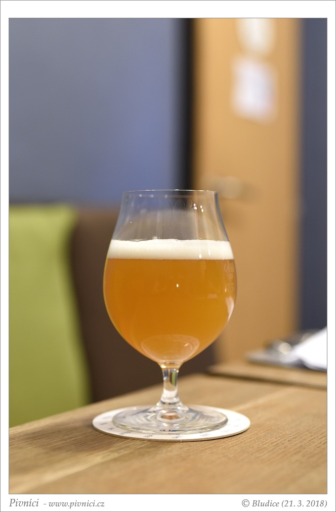 Světle zlatá barva, velmi zakalené. Pěkná světlá pěna, dobře drží.Vůně (3,5 - velmi dobré):