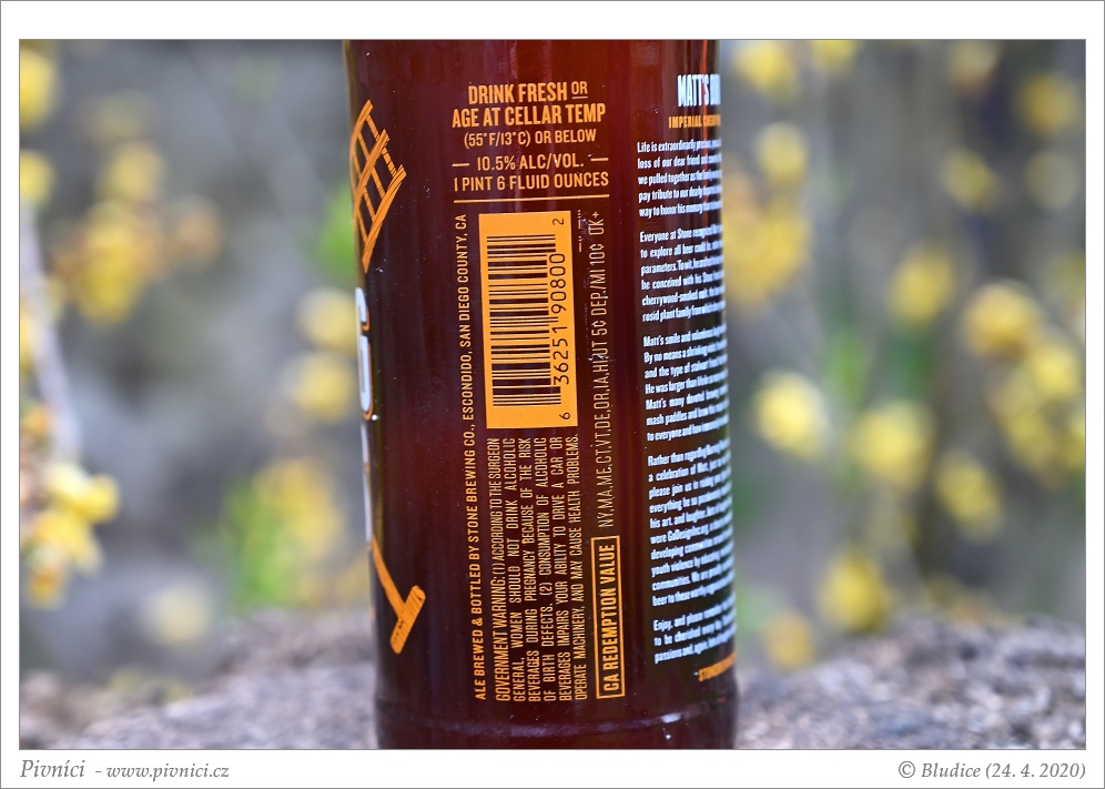 Vůně sladová, karamelová, medová, peprná, s tóny jablečných křížal, uzenými tóny, nádechem třešní, citronové kůry.Chuť (4,5 - úchvatné):