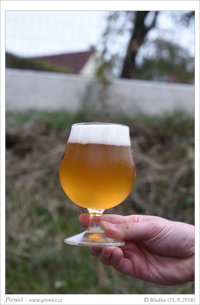 Tmavší zlatá barva, středně zakalené. Pěkná světlá pěna, výborně drží.Vůně (3 - dobré):