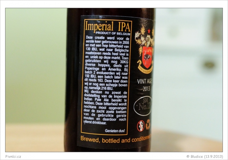 Nižší jemný říz, vysoká plnost. V chuti sladové, karamelové, toffee, lehce oříšky, s vysokou chmelovou hořkostí a výrazně citrusově chmelovými tóny (grepy, mandarinky, pomerančová kůra), lehce kořeněné. Doznívání je dlouhé citrusové s tóny pomerančové kůry a lehce karamelu. Alkoholová hřejivost na závěr.Celkový dojem (9 - výjimečné pivo):