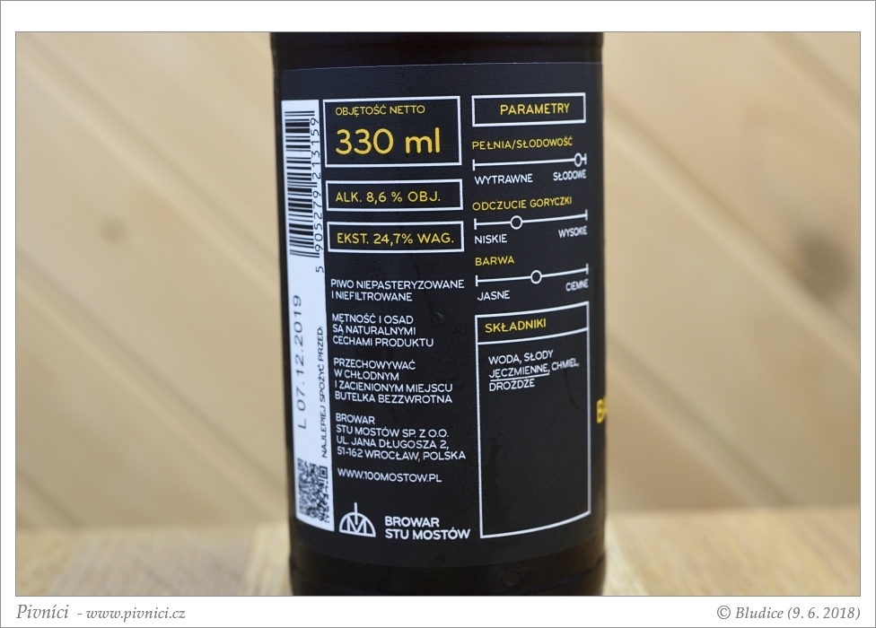 Osobité pivo, hodně sladové, trochu zvláštně kořeněné. Ve výsledku se popíjí dobře.Minimální trvanlivost: 7. prosince 2019