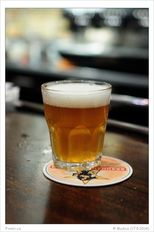 Zlatá barva, lehce zakalené, slušná světlá pěna, průměrně drží.Vůně (3 - dobré):
