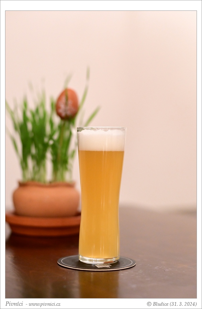 Zlatá barva, velmi zakalené. Pěkná světlá pěna, dobře drží.Vůně (4 - výborné):