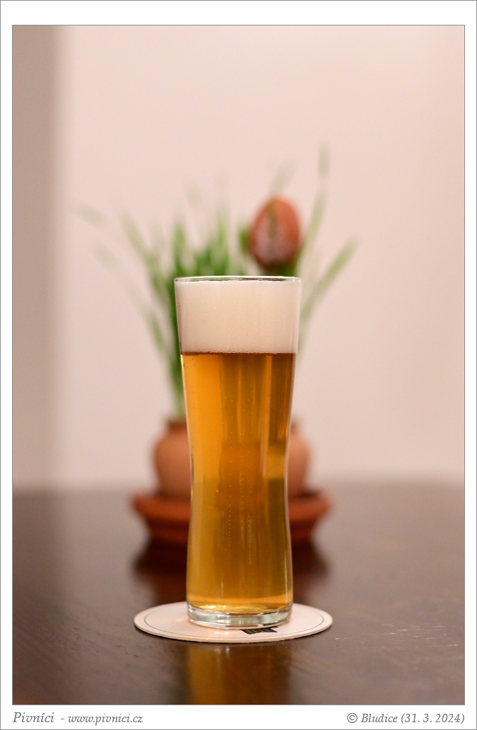Tmavě zlatá barva, velmi lehce zakalené. Pěkná světlá pěna, výborně drží, hezky kroužkuje.Vůně (4 - výborné):