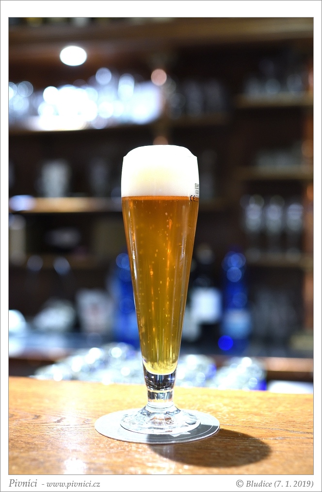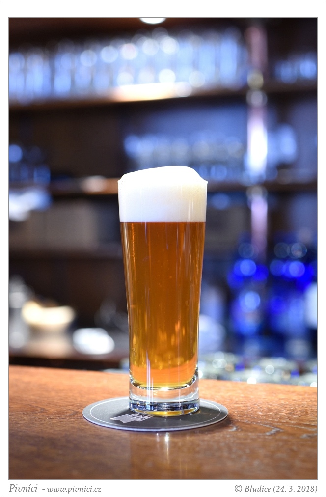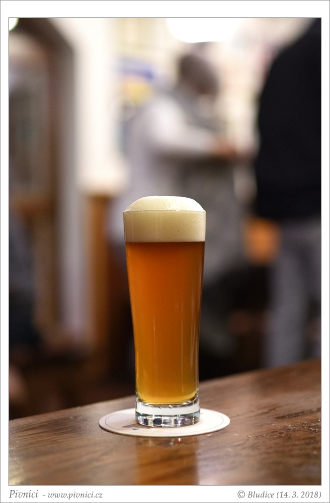 Zlatá barva, téměř čiré. Pěkná světlá pěna, dobře drží.Vůně (4 - výborné):