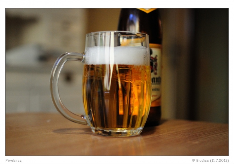Zlatá barva, čiré, slušná světlá pěna, celkem drží.Vůně (2,5 - lehce nadprůměr):