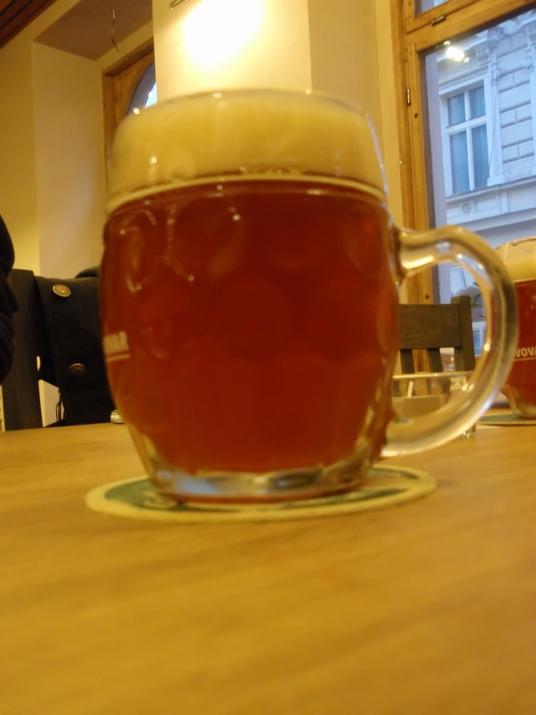 Barva jantarová (lehce do červena), velmi zakalené, ucházející světle okrová pěna.Vůně (1,5 - nedobré):