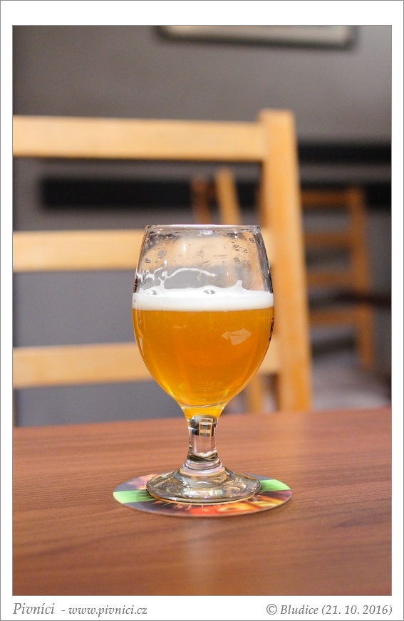 Zlatá barva, lehce zakalené, pěkná světlá pěna, dobře držíVůně (3,5 - velmi dobré):