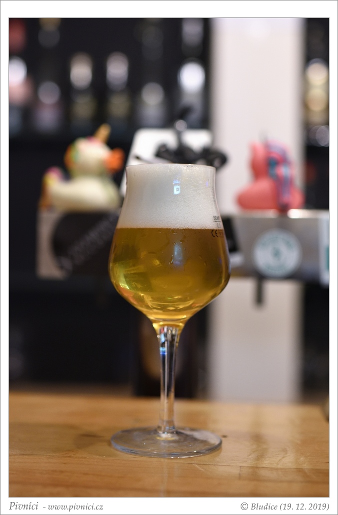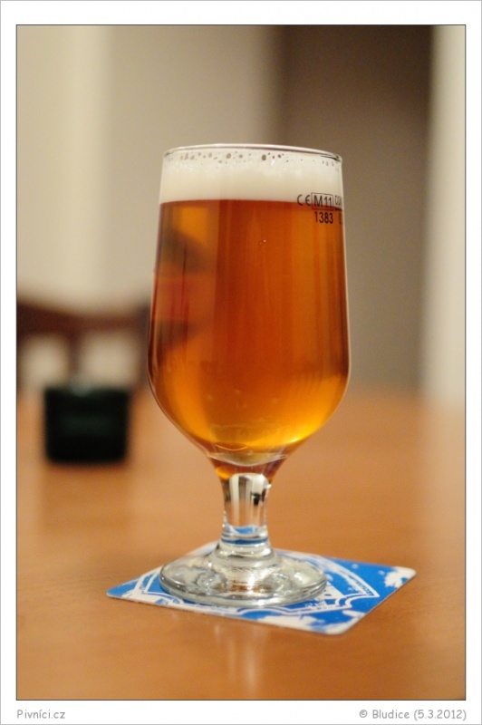 Zlatá barva, téměř čiré. Pěkná světlá pěna, dobře drží.Vůně (3,5 - velmi dobré):