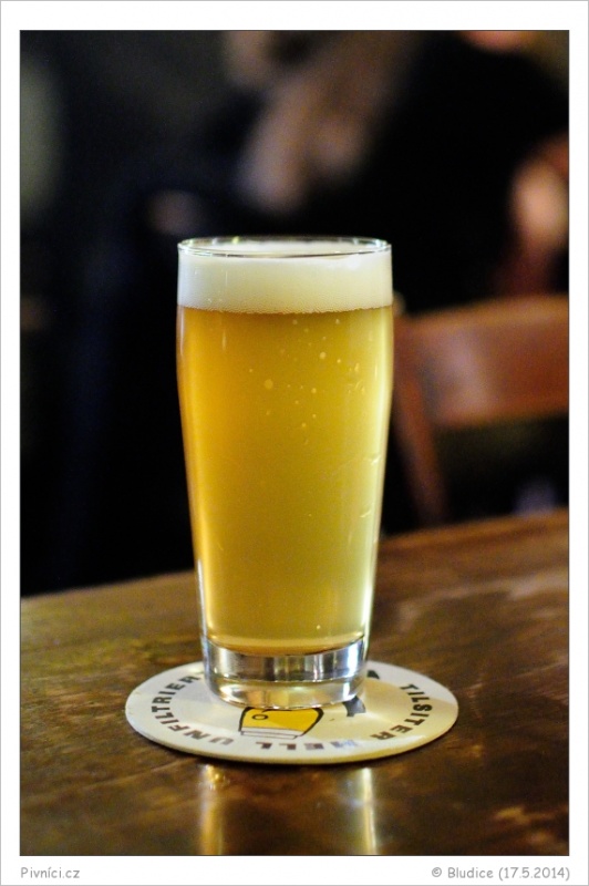 Slámová barva, lehce zakalené, slušná bílá pěna, průměrně drží, ale pěkně kroužkuje.Vůně (3,5 - velmi dobré):