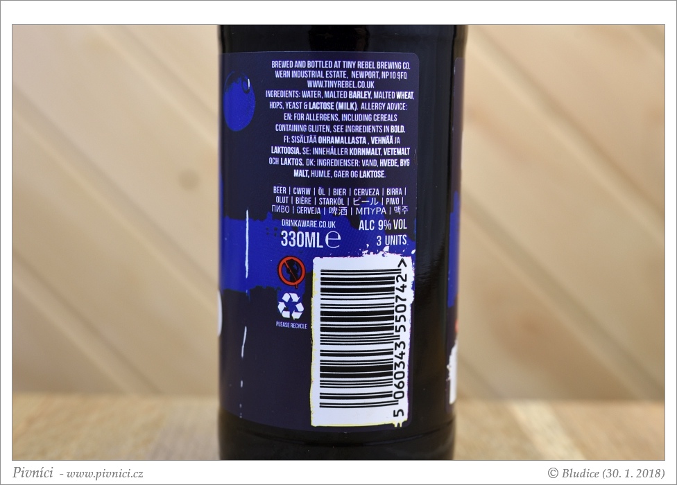 Barva velmi tmavá, téměř černá. Nižší pěkná hustá průměrně stabilní pěna světle béžové barvy.Vůně (3 - dobré):