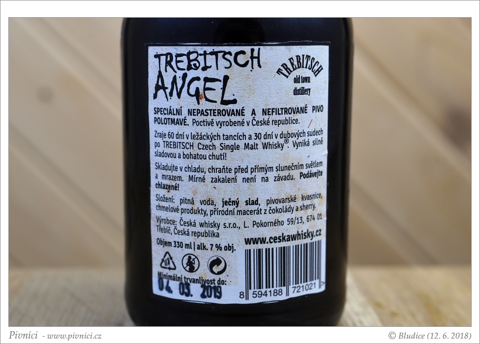Ze tří Tribisch Angelů je pro mě tento asi nejpitelnější, nejspíš díky tomu, že chutí čokolády a třešní přebili chuť původního piva.Minimální trvanlivost: 4. března 2019