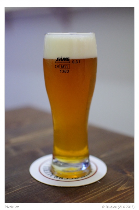 Tmavší zlatá barva, velmi lehce zakalené, slušná světlá pěna s okrovým nádechem, lehce kroužkuje.Vůně (2,5 - lehce nadprůměr):