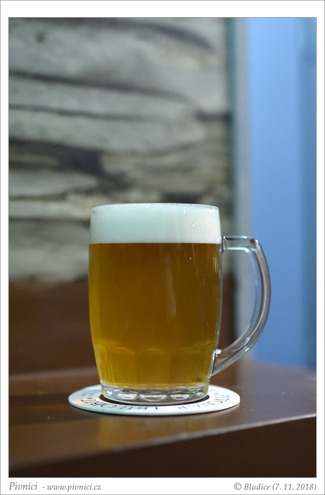 Zlatá barva, čiré, pěkná světlá pěna, dobře drží.Vůně (3,5 - velmi dobré):