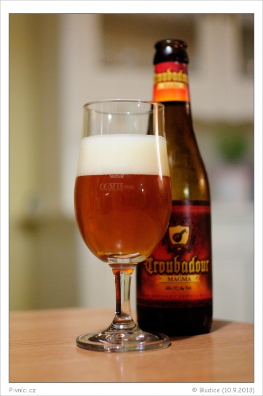 Tmavší zlatá barva, velmi lehce zakalené, hezká světlá pěna.Vůně (4,5 - úchvatné):