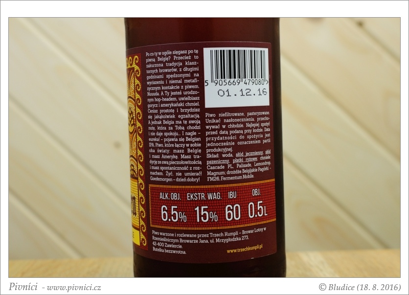 Celkem divočina, hodně kořeněné, zakalenější, ale ve výsledku se nepije úplně blbě.Minimální trvanlivost: 1. prosince 2016
