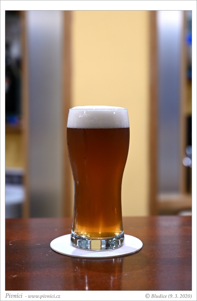 Tmavě zlatá barva, lehce až středně zakalené. Pěkná světlá pěna, dobře drží.Vůně (2,5 - lehce nadprůměr):