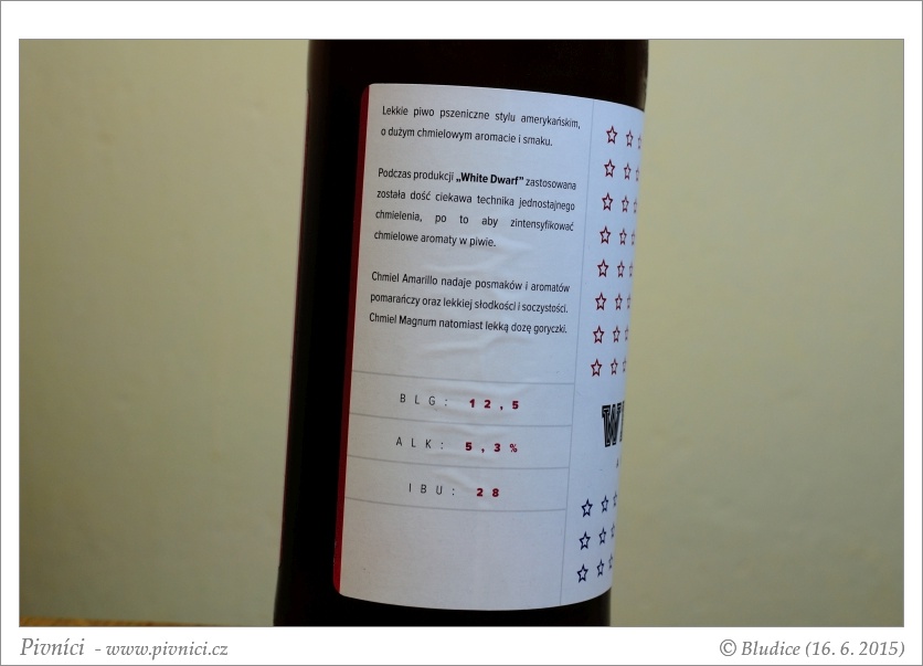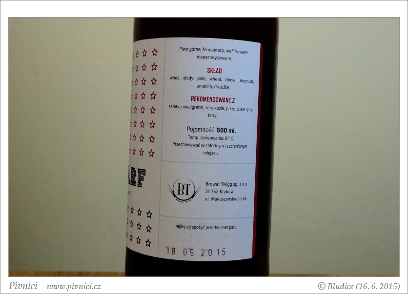 Ne úplně čisté pivo, takové trochu domovarnické, ale pije se celkem dobře.Minimální trvanlivost: 18. září 2015