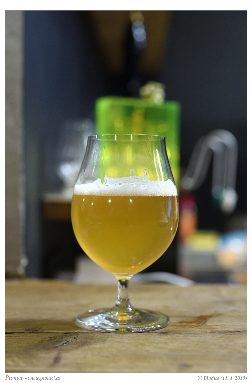 Zlatá barva, lehce zakalené. Pěkná světlá pěna, dobře drží.Vůně (3,5 - velmi dobré):