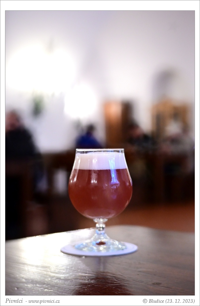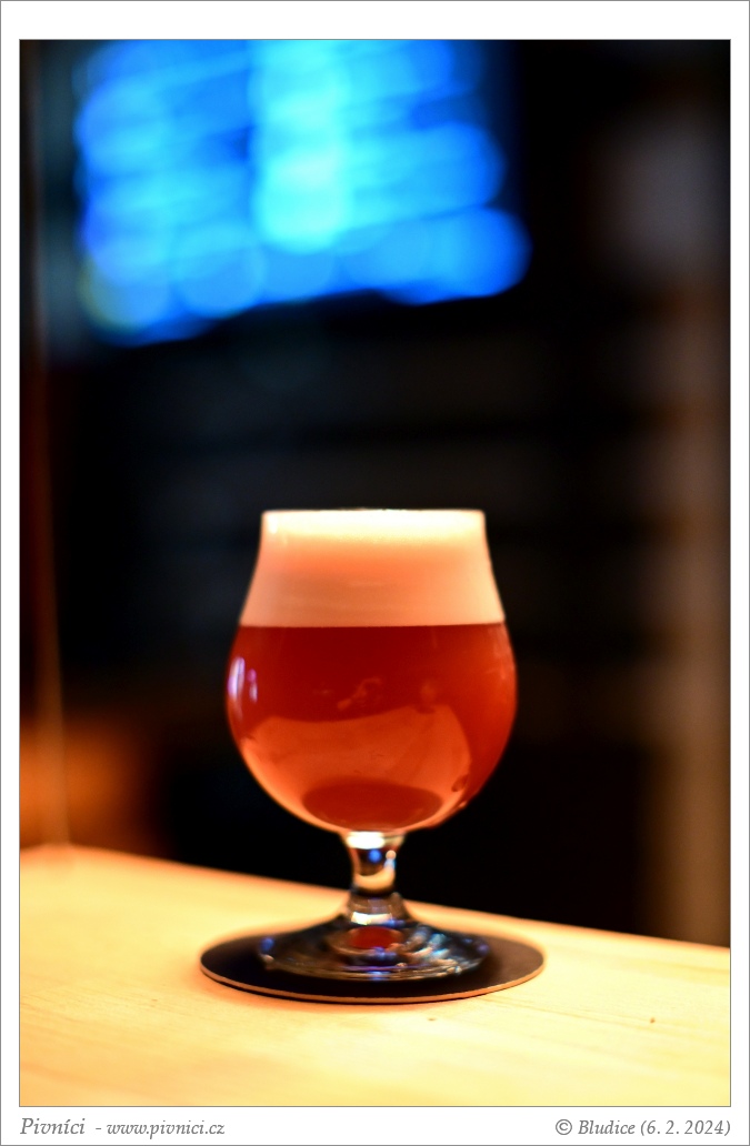 Rubínová barva, více zakalené. Pěkná světlá pěna s růžovým nádechem, dobře drží.Vůně (4 - výborné):