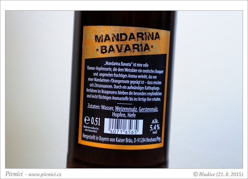 Vůně mandarinková, broskvová, banánová, obilná, kořeněná hřebíčková, nasládlá.Chuť (3,5 - velmi dobré):