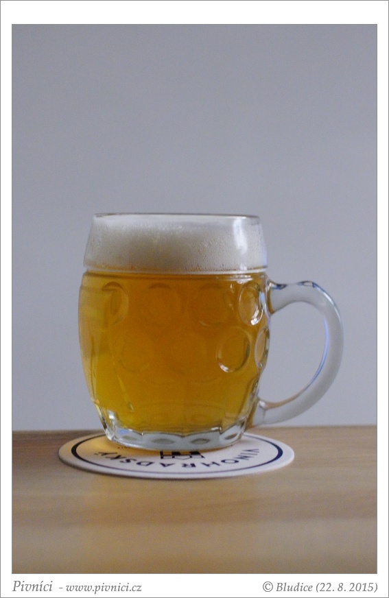 Zlatá barva, středně zakalené, pěkná světlá pěna, dobře drží.Vůně (2,5 - lehce nadprůměr):