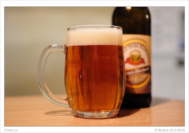 Jantarová barva, čiré, průměrná bílá pěna, brzy padá.Vůně (3,5 - velmi dobré):