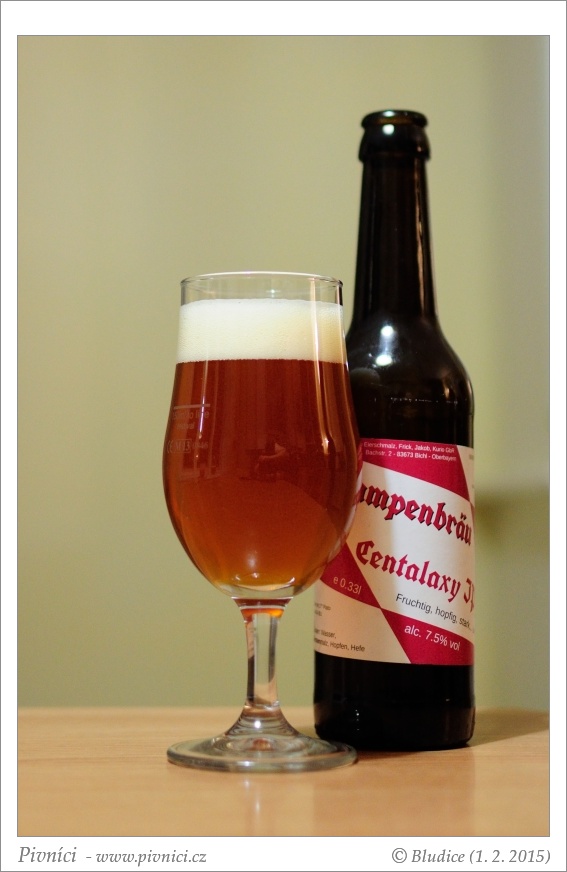 Barva světle měděná, velmi lehce zakalené. Pěkná hustá velmi stabilní pěna. Kroužkuje.Vůně (2,5 - lehce nadprůměr):