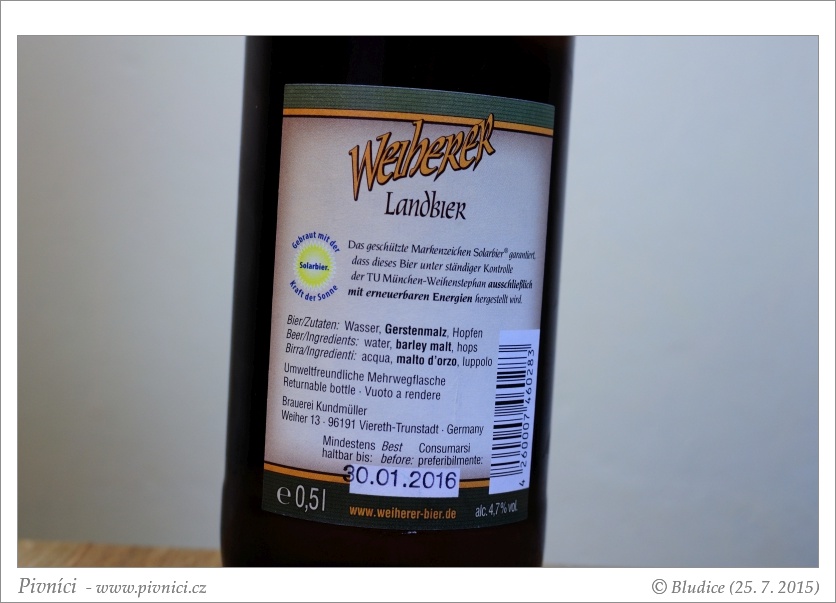 Čisté, pěkně chmelené, velmi dobře pitelné pivo.Minimální trvanlivost: 30. ledna 2016