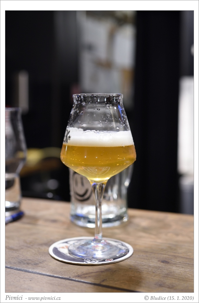 Zlatá barva, velmi lehce zakalené. Pěkná světlá pěna, slušně drží.Vůně (3,5 - velmi dobré):