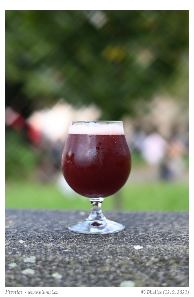 Temně rubínová barva, lehce až středně zakalené. Slušná světlá pěna s růžovým nádechem, celkem drží.Vůně (4 - výborné):